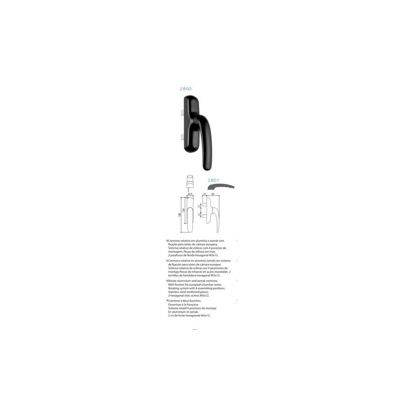 Cremone rotativo em alumínio e zamak, com fixação para séries de câmara europeia.
