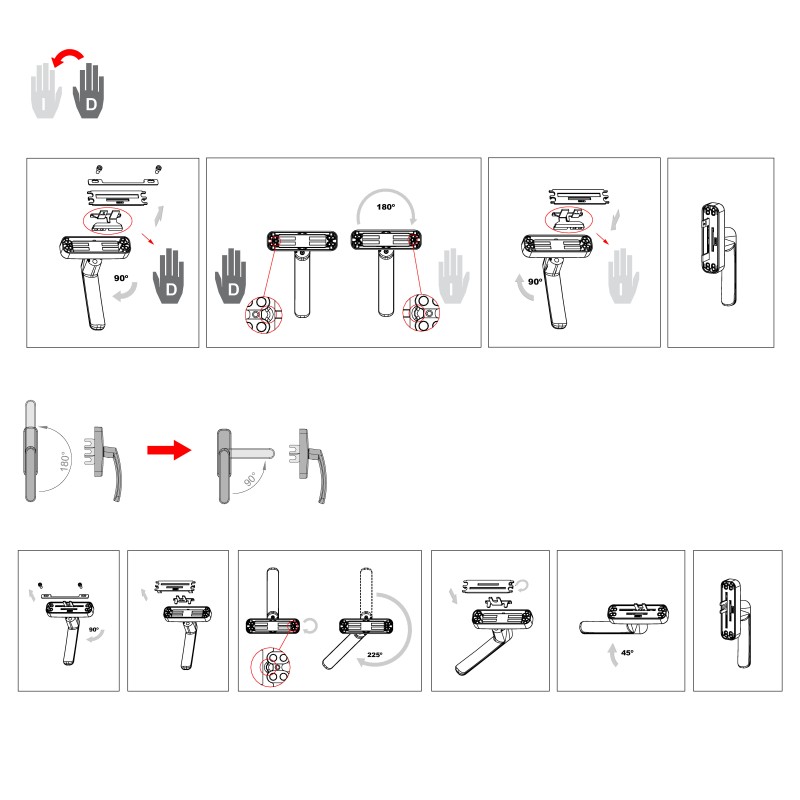 O cremone LEO BLOCK é fornecido para a abertura à direita mas pode ser mudado para a esquerda alterando a posição das palas de transmissão;
