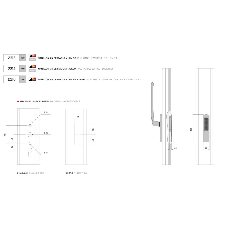 Gama de puxadores e pegas para sistemas de corrediça elevável.