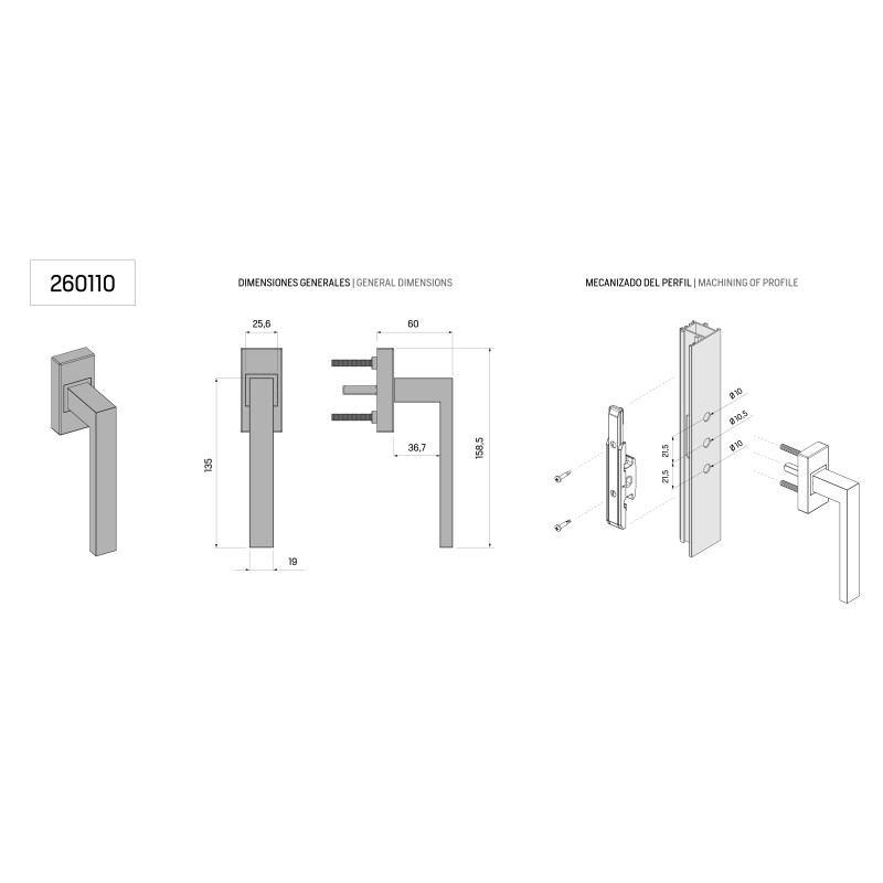Puxador em aço inoxidável para janelas de batente ou oscilobatentes.